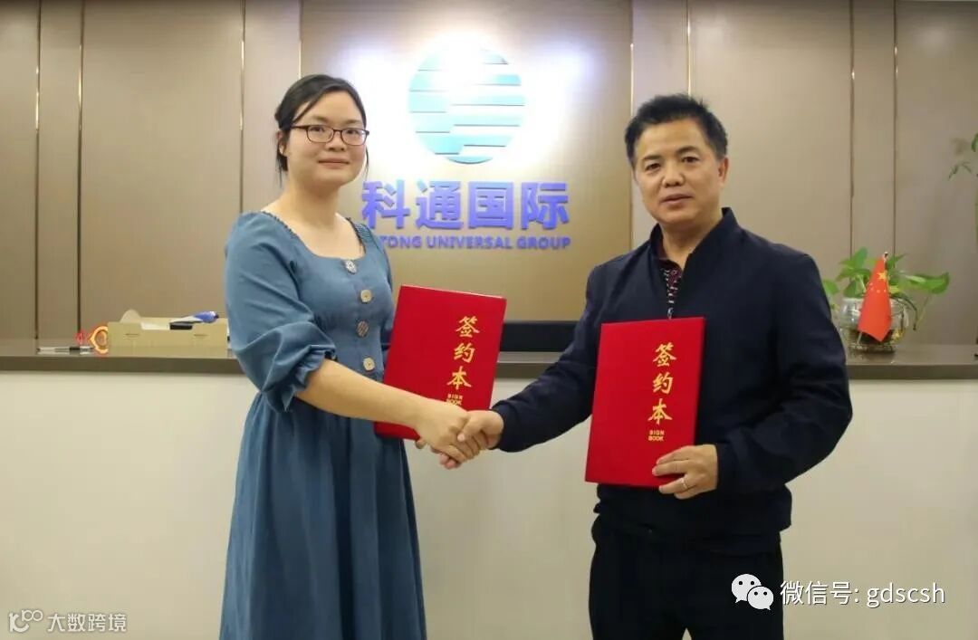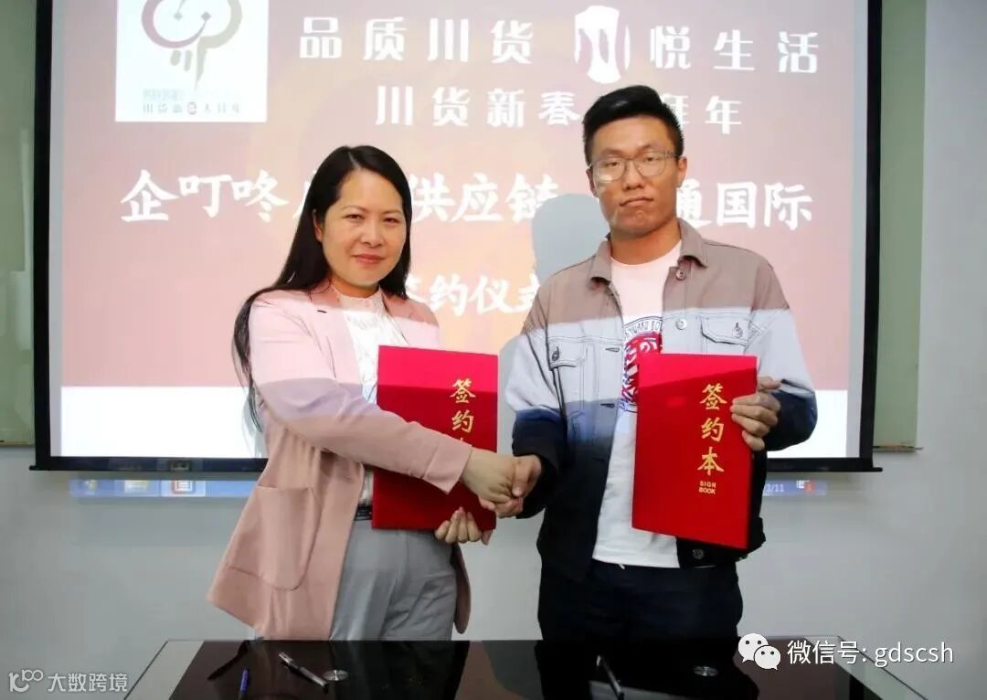 3月12日科通国际展览(广州)有限公司川货出川项目总经理胡永刚与广州云创天驰科技有限公司供应链中心总监王婉婷女士签署直播、社群电商合作协议