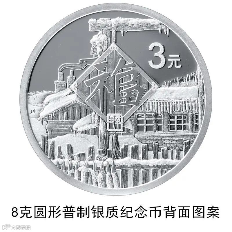 2021年的贺岁币,将我们带到了白雪皑皑的雪乡。圆滚滚的雪蘑菇、炊烟缥缈的木房子、屋檐下挂着的冰溜子、远处玩雪的“熊孩子”,中间挂着大福字……整个币面都透着浓浓的烟火气息,充满了幸福生活的暖意。