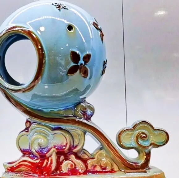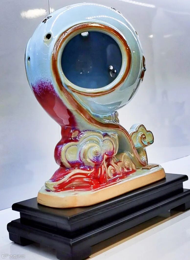 该作品不仅造型精巧雅致、饱满流畅,创意十足而且还兼具香薰的实用功能,满月的球体中可放置燃香,使拜月燃香的古老民俗有了钧瓷的载体。