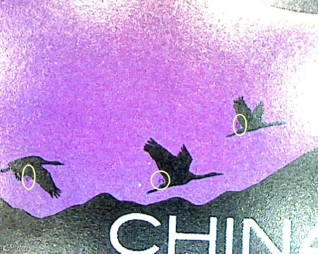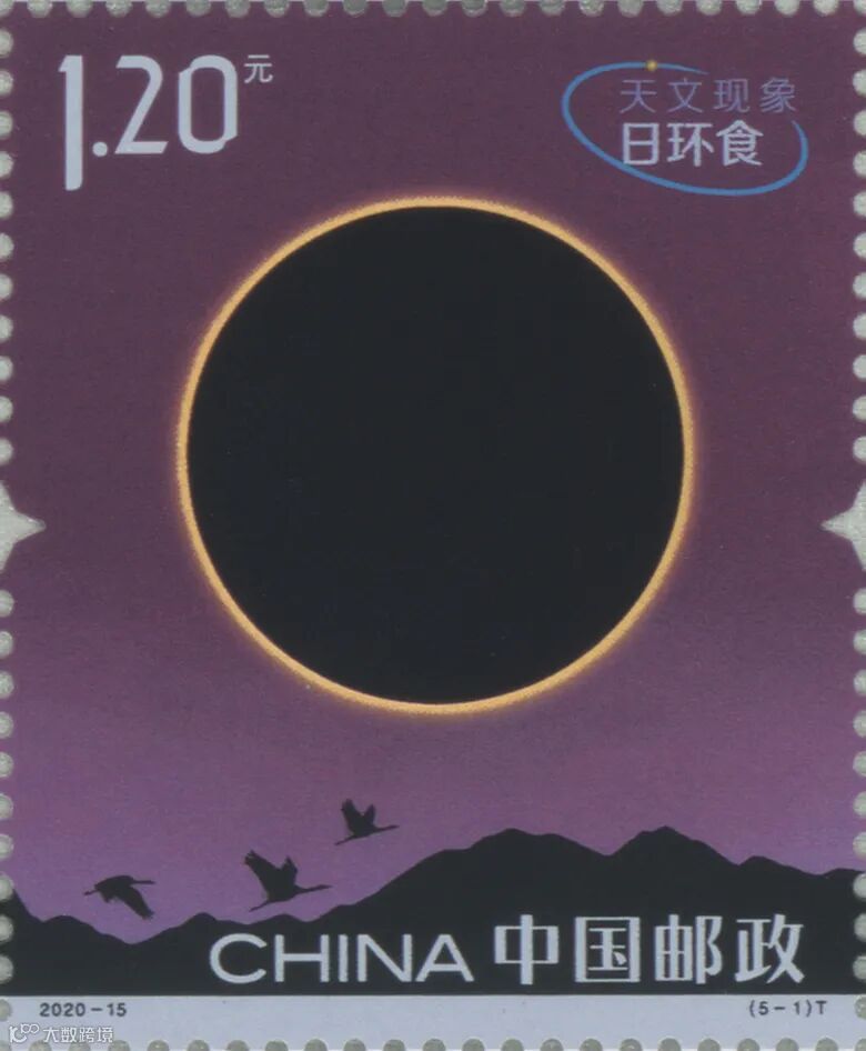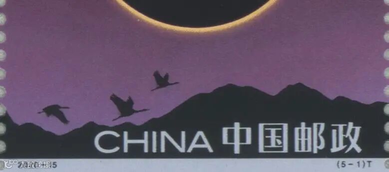 第1枚为“日环食”汉语拼音首字母“RHS”,位于地景飞翔的黑颈鹤身下。
