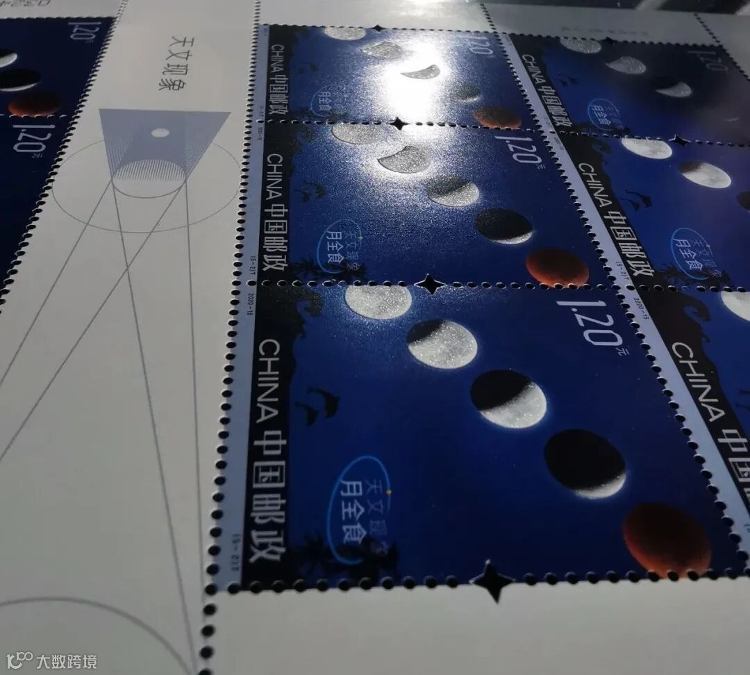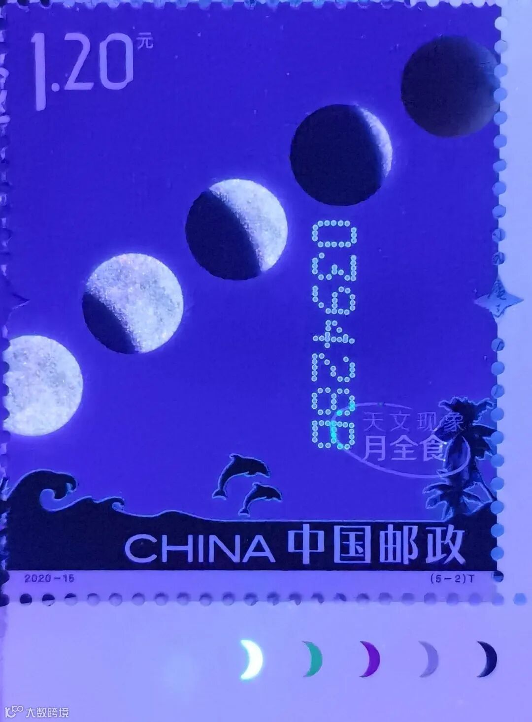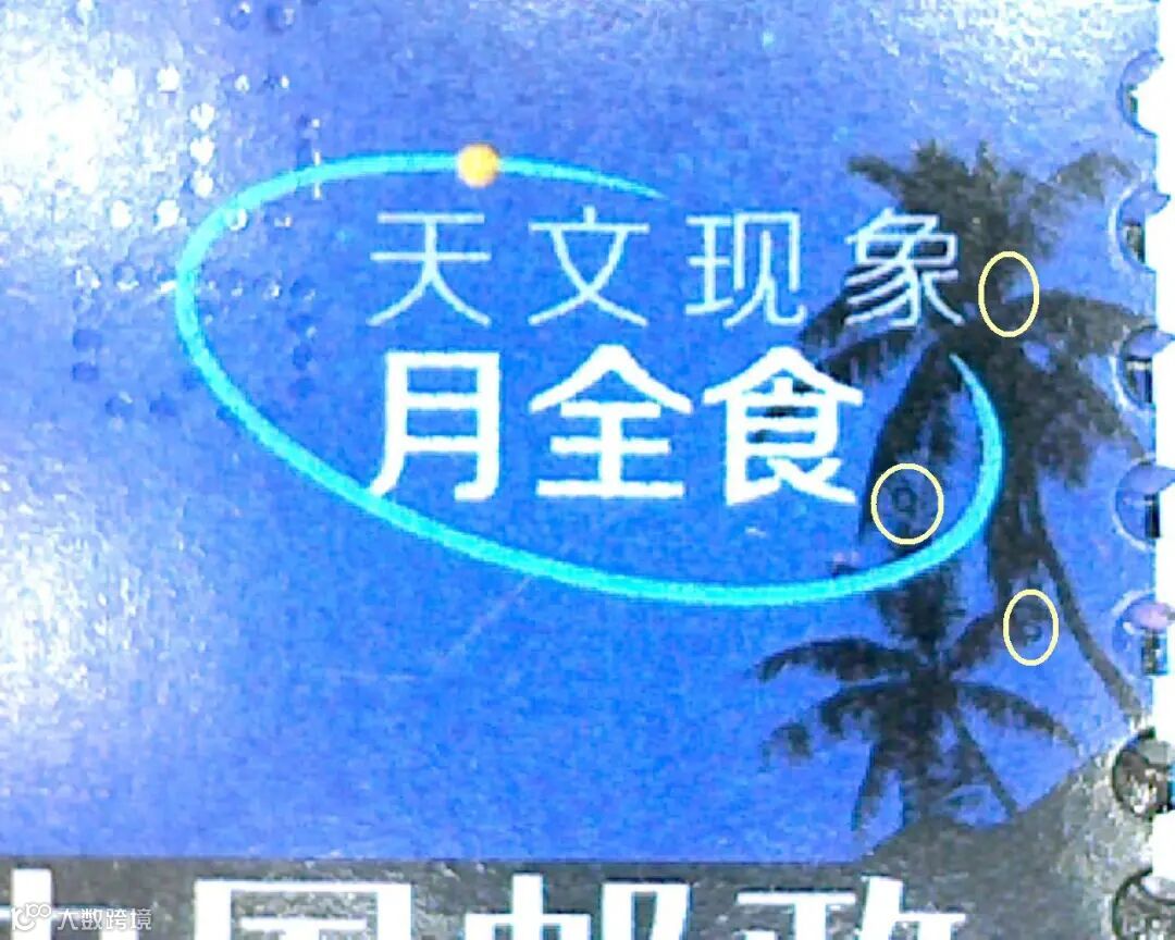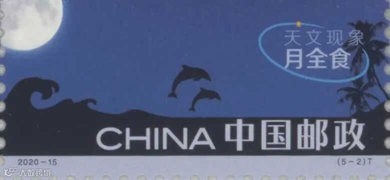 第2枚为“月全食”汉语拼音首字母“YQS”,位于邮票右下角票名后的椰子树中。