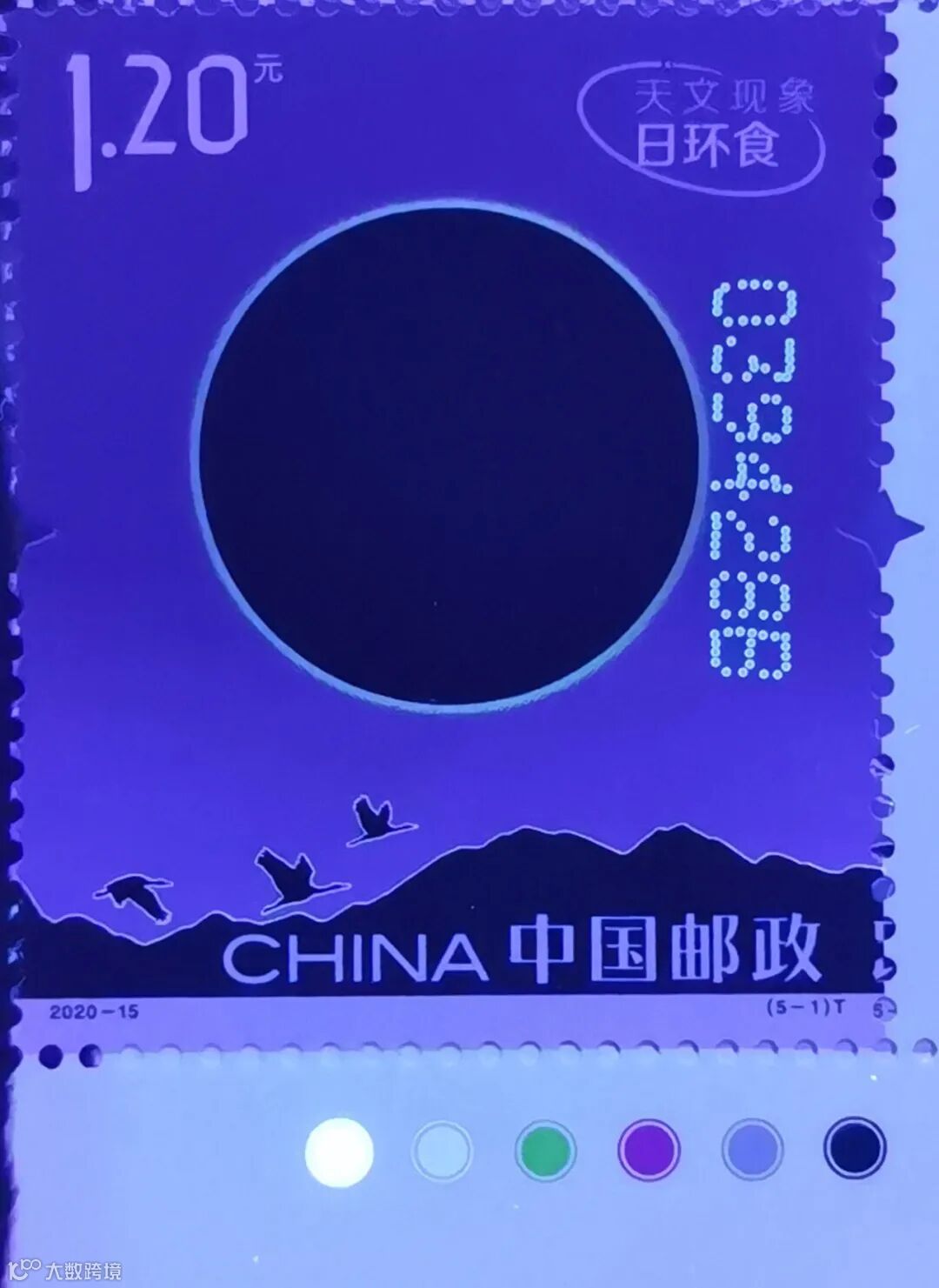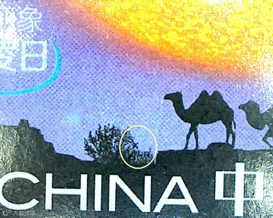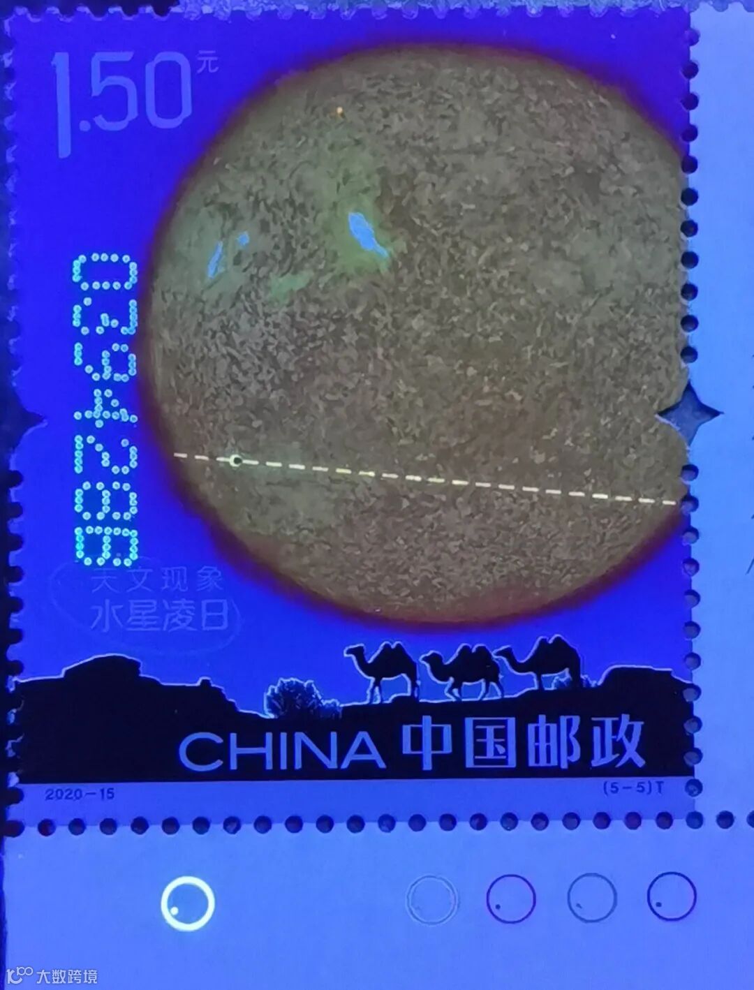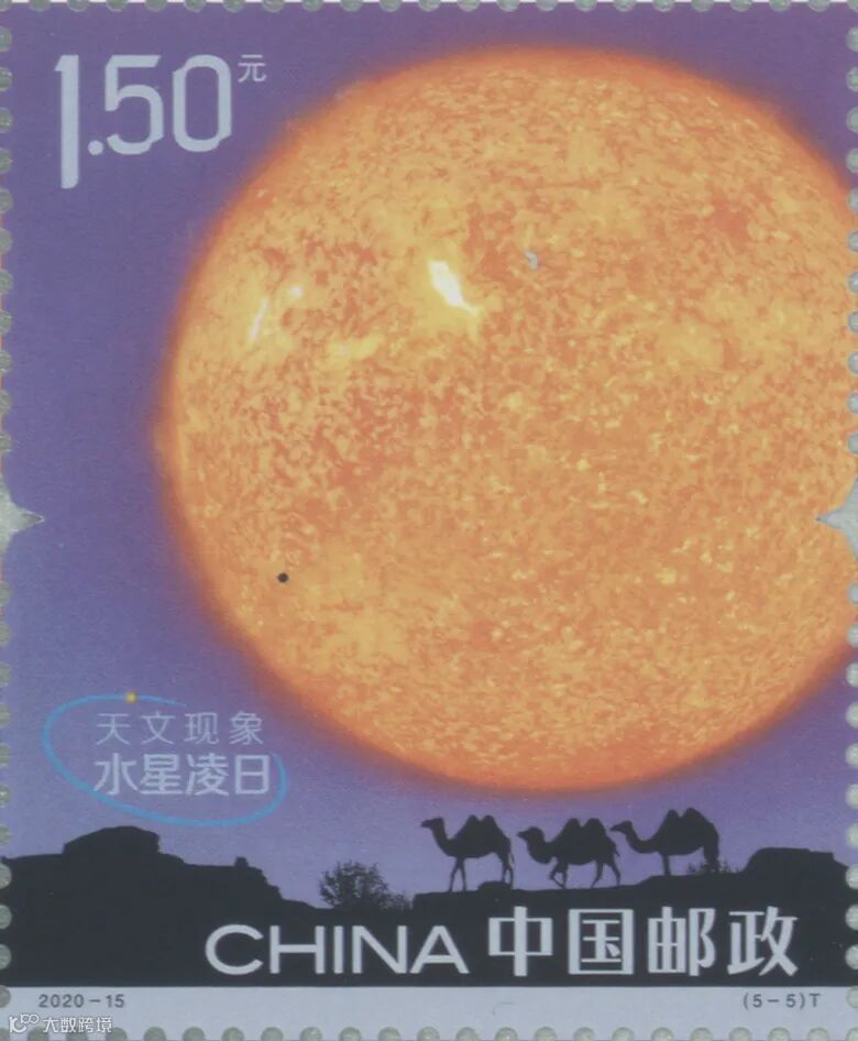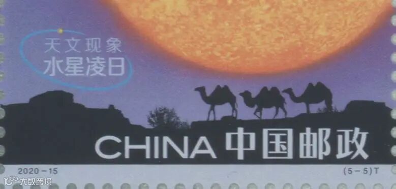 第5枚为“水星凌日”汉语拼音首字母“SXLR”,位于邮票下方,骆驼前的树丛上。
