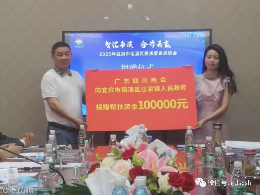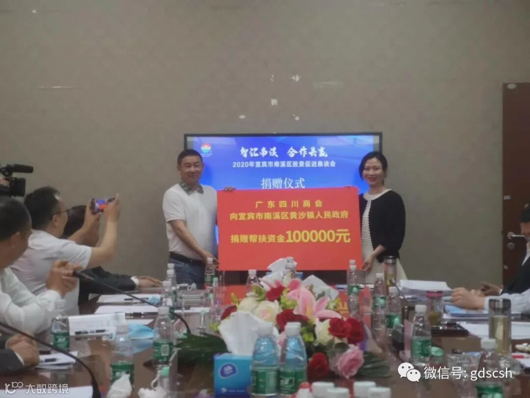 会议还举行了捐赠仪式,广东四川商会分别向宜宾市南溪区黄沙镇、汪家镇各捐赠10万元。商会监事长熊宗友代表商会捐赠。
