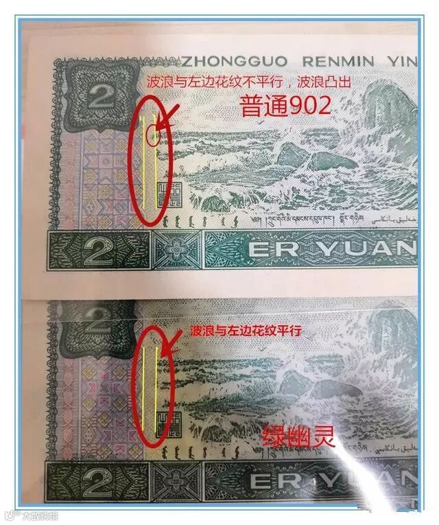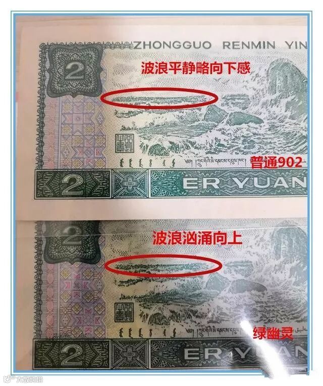 2、绿幽灵的水浪波纹是向上的,而普通的902波纹是向下的。