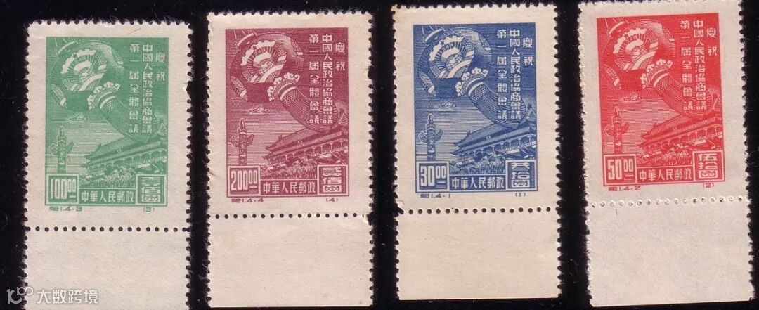 这套被铭记为“纪1”的新中国纪念邮票第一套,共四枚,同一邮图,面值与刷色不同。
