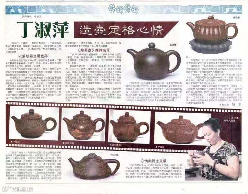 丁淑萍,国家级高级工艺美术师,世界艺术家联合会会员,中国工艺美术学会会员,江苏省工艺美术协会会员。丁淑萍,生于陶艺世家,八十年代开始涉足紫砂壶的创作,擅长全手工制作各种紫砂艺术作品。对光壶和筋纹壶的制作颇有心得,能突出作品的精、气、神、韵。制作花器和像形壶,善于以自然为创作题材,从自然界的具体形象中提炼出高于自然的艺术典型来效仿自然。仿真作品形象逼真,栩栩如生,具有浓郁的生活气息和自然情趣。深受中外客商的青睐。