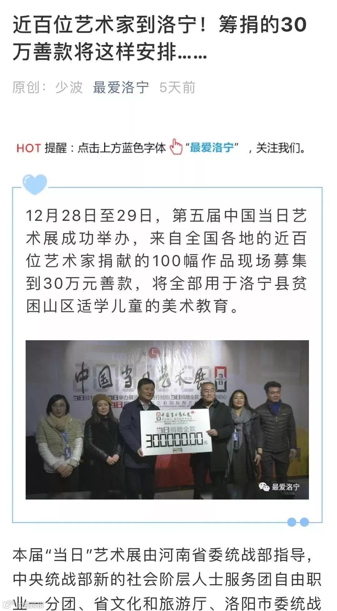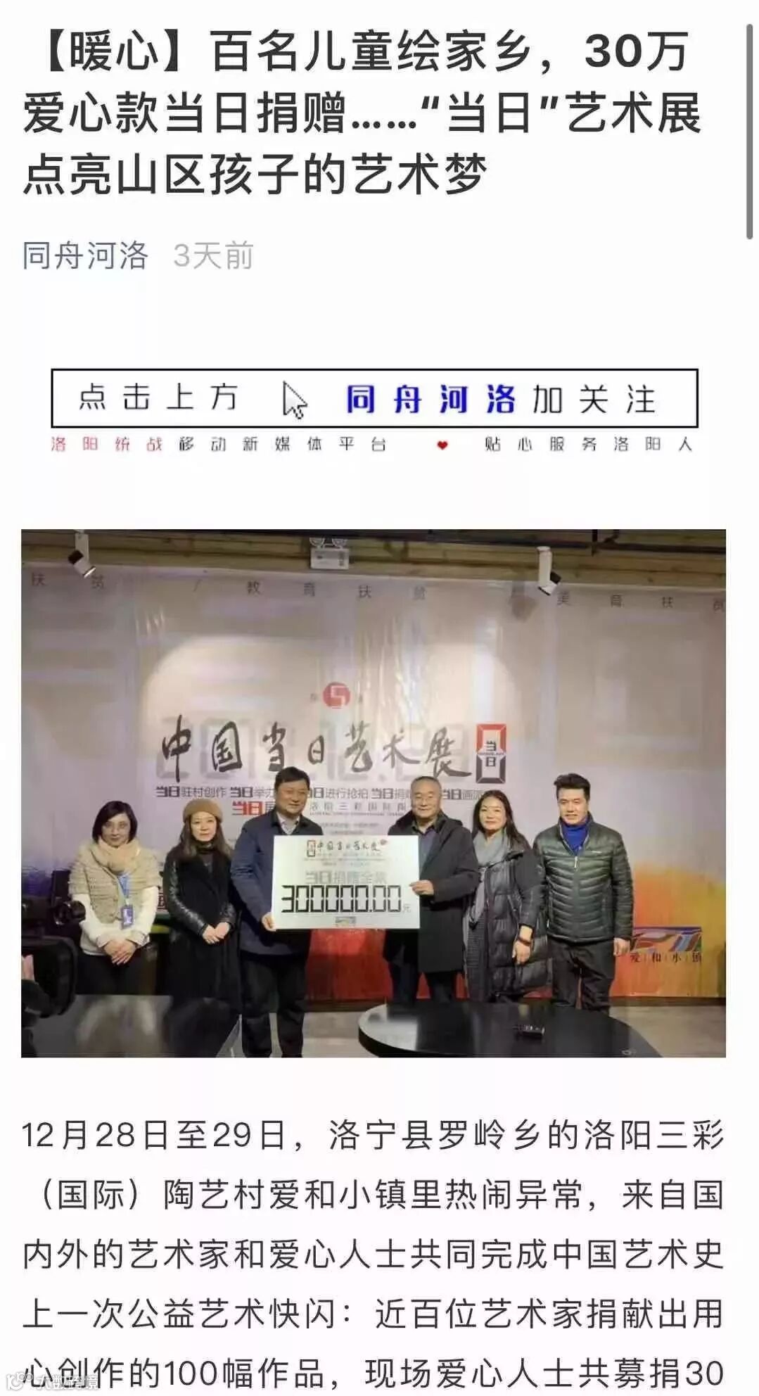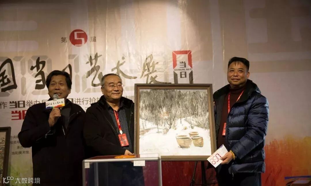 最后,由洛阳师范学院校长梁留科代表主办单位向洛宁县捐赠第五届中国【当日】艺术展募集的爱心善款30万元整,洛宁县县长周东柯代表洛宁县接受捐赠,俞红、占兰、王嘉、杨志等【当日】艺术家代表共同上台捐赠。