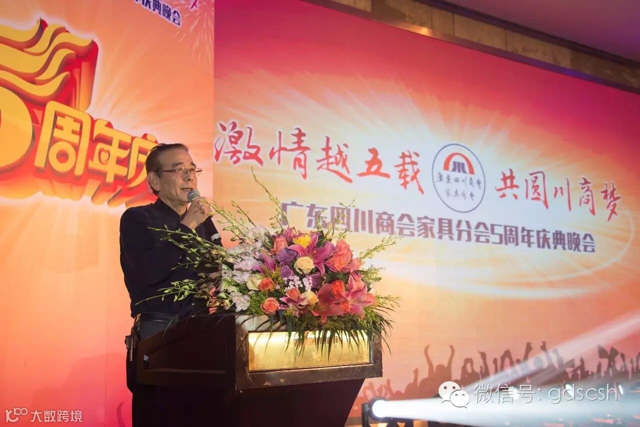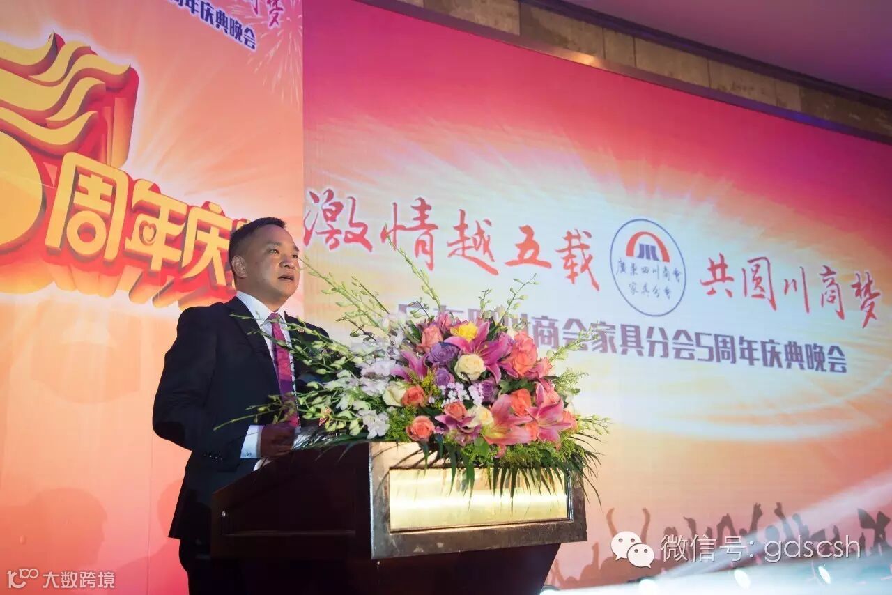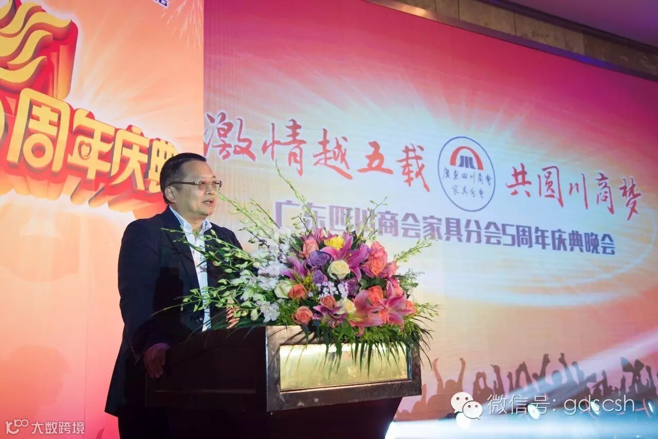 在庆典上,王开庆会长率先讲话,介绍了广东四川商会的历史及我会会员回川投资的情况,并指出家具分会是我会的行业分会中优秀分会之一,一直以来都比较团结,希望今后更加精诚团结,共谋发展,合作共赢。接着,家具分会会长朱玉山代表东道主上台致欢迎词,感谢总商会的支持,以及家具分会往届领导班子对商会做出的贡献,并介绍家具分会的情况以及发展历程,分享了家具行业互联网+的心得与做法。我会特邀顾问刘福和主讲了“中国梦,川商梦”,论述了川商在我国历史进程中的重要地位和重大贡献,肯定了川商在经济发展新常态下的重要作用。四川省人民政府驻广州办事处副主任王强对家具分会五周年庆表示了热烈祝贺,讲到在当前经济环境下企业要稳住阵脚,抱团共度时艰。