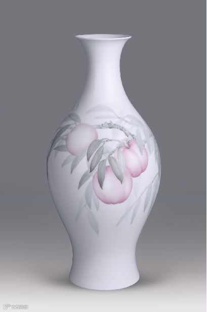 作品以清代橄榄瓶为体,撇口、细颈、鼓腹、圈足,器形正,釉面细腻如脂,果类题材父亲所做不多,原因之一釉下彩绘时不易把握,难尽人意。寿桃极富陈氏审美的淡雅莹润,发色温和,绿色、粉色、玛瑙红过度自然,十个寿桃压坠枝头,布局考究,洋溢着欢快喜庆的情致,寓多子多寿,富贵圆满之意。