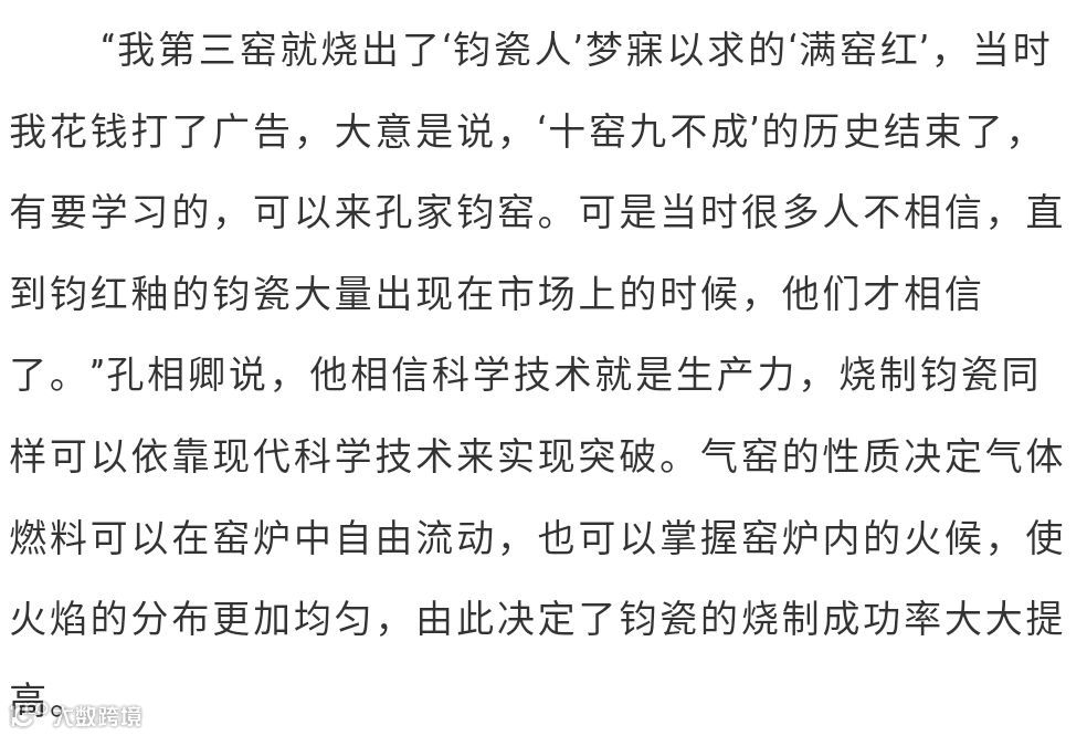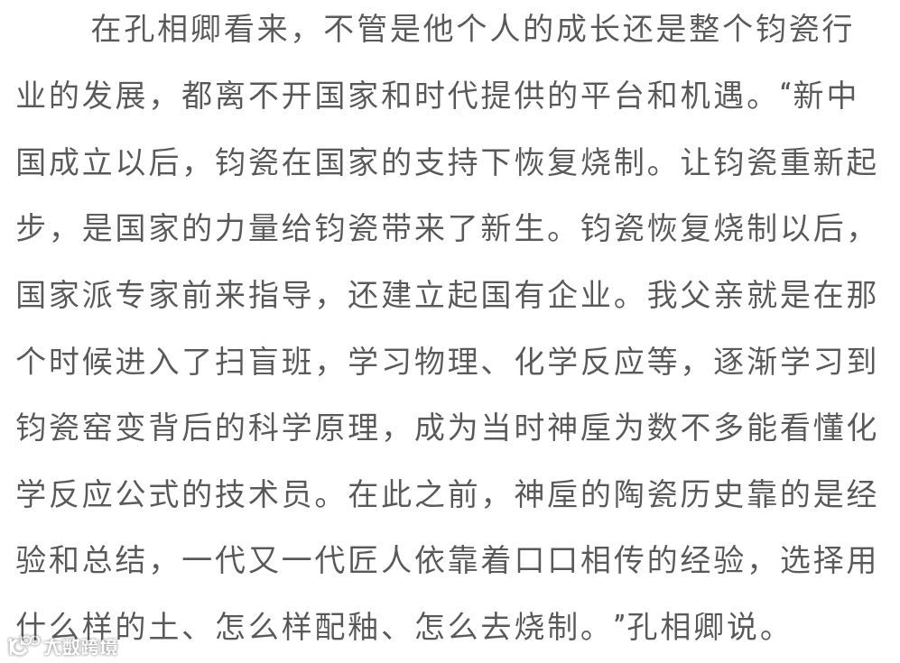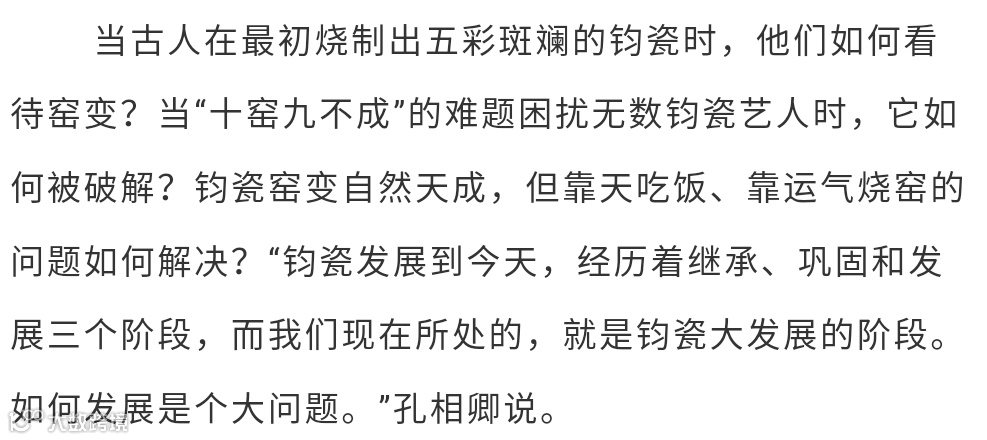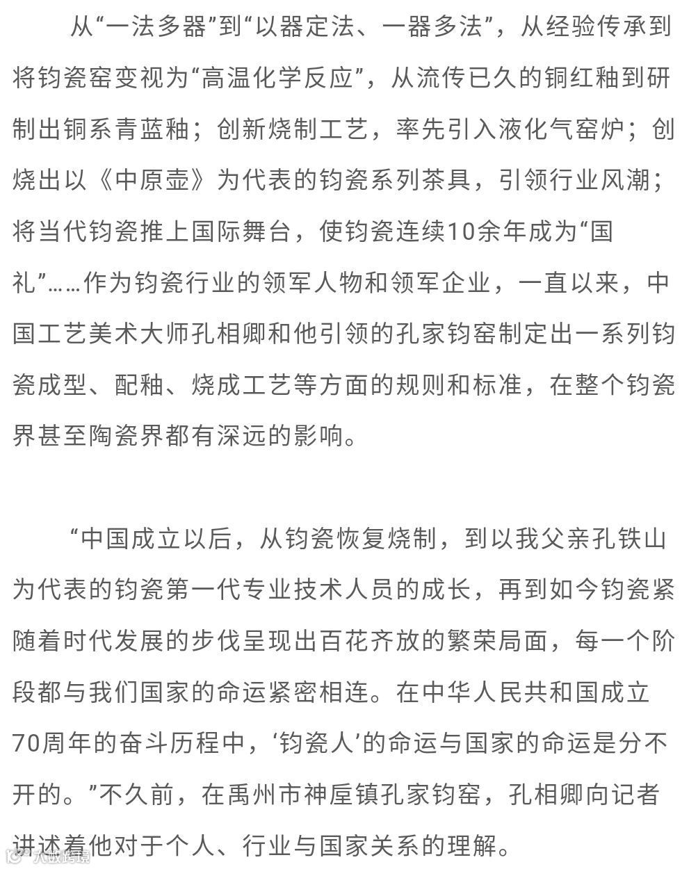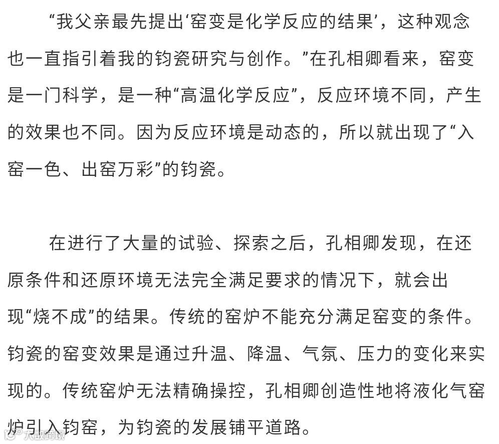 1992年创办孔家钧窑,以创立现代钧瓷生产工艺体系、逐步破解窑变之谜、丰富钧瓷的艺术表现形式、积极探索钧瓷产业化新路径、成功研制铜系青蓝釉等杰出成绩,成为钧瓷界公认的领军人物。