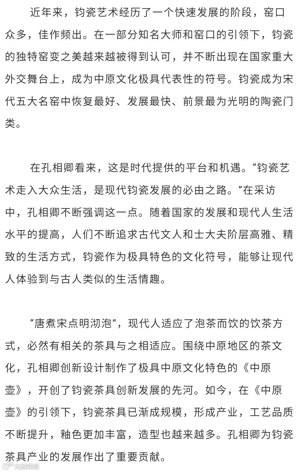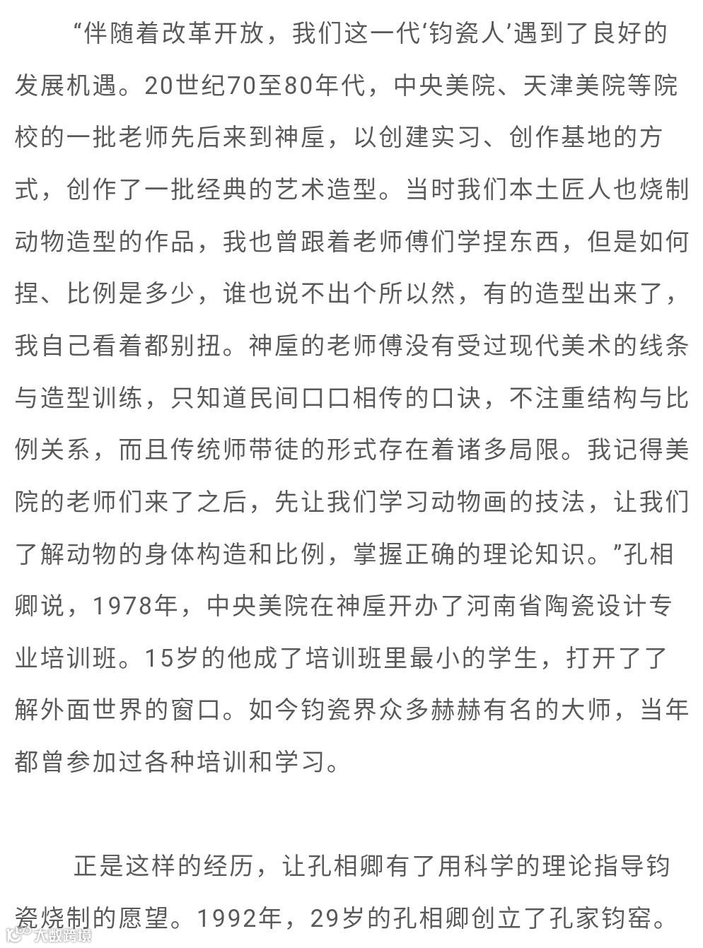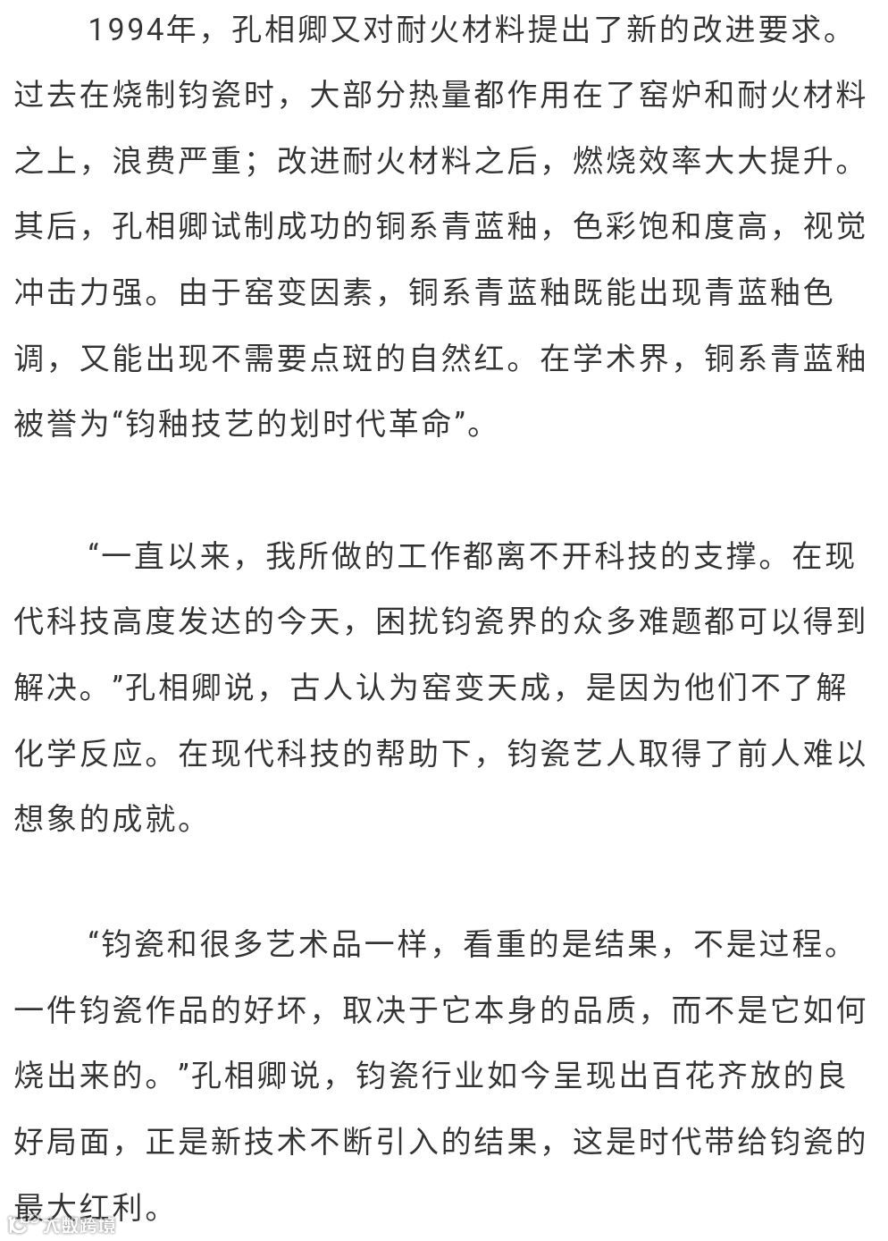1992年创办孔家钧窑,以创立现代钧瓷生产工艺体系、逐步破解窑变之谜、丰富钧瓷的艺术表现形式、积极探索钧瓷产业化新路径、成功研制铜系青蓝釉等杰出成绩,成为钧瓷界公认的领军人物。