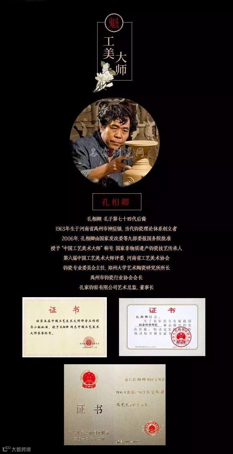 孔相卿,汉族,1963年出生于禹州市神垕镇,孔子第74代后裔,中国工艺美术大师、中国工艺美术大师评委、国家级非物质文化遗产(钧瓷烧制技艺)代表性传承人、享受国务院特殊津贴专家;