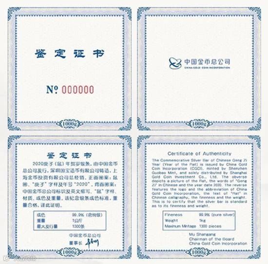 该系列每一款银条均配有中国金币总公司出具的防伪鉴定证书。
