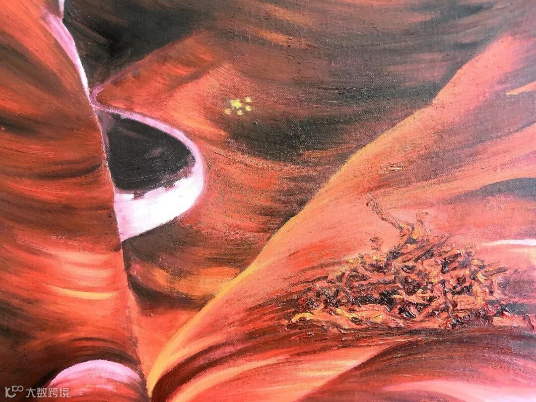 作品的左边是无尽的黑暗,代表了抗日战争时期,革命先烈为我们的祖国做出的伟大牺牲。这段历史尽管有黑暗,但最后是光明的,正如作品黑色上方,渐变为红色,代表着我们祖国的发展欣欣向荣。