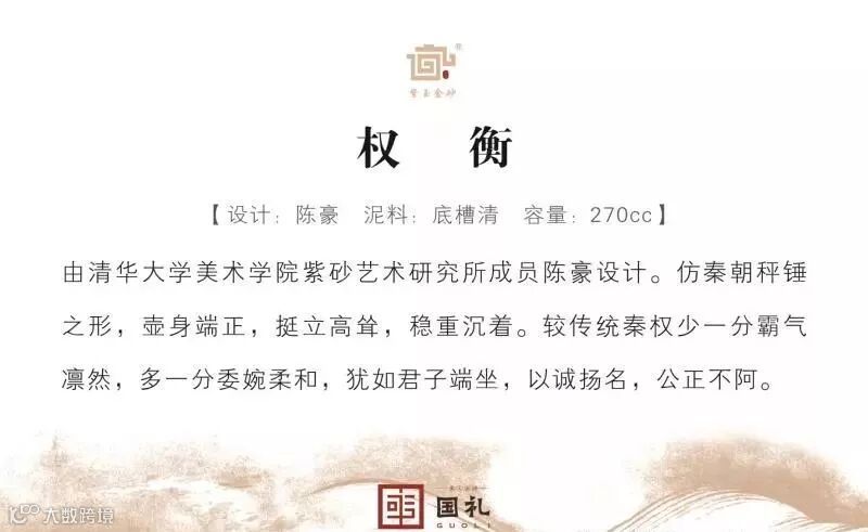 “权衡”由清华大学美术学院紫砂艺术研究所成员陈豪设计。仿秦朝秤锤之形,壶身端正,挺立高耸,稳重沉着。较传统秦权少一分霸气凛然,多一分委婉柔和,犹如君子端坐,以诚扬名,公正不阿。权衡轻重, 斟酌古今。和而能壮, 丽而能典。焕乎若五色之成章, 纷乎若八音之繁会。以秦权为首, 气华色,和而不同。
