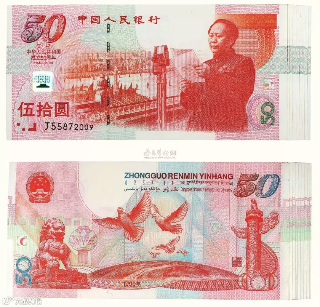中华人民共和国建国50周年纪念钞背面票面设计。背面主景素描稿创作与绘制、正面票面部分设计货币设计组织工作。