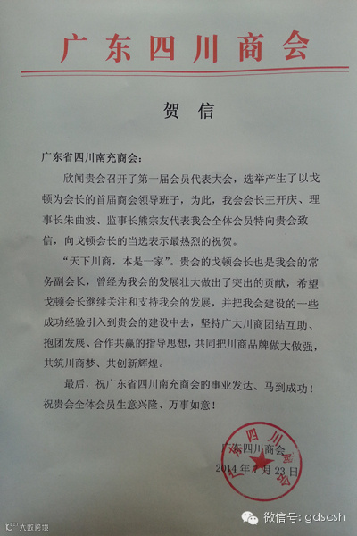 广东四川商会7月23日,我会会长王开庆、理事长朱曲波、监事长熊宗友代表我会全体会员向广东省四川南充商会发出贺信,对我会常务副会长戈顿当选为广东四川南充商会会长表示最热烈的祝贺。