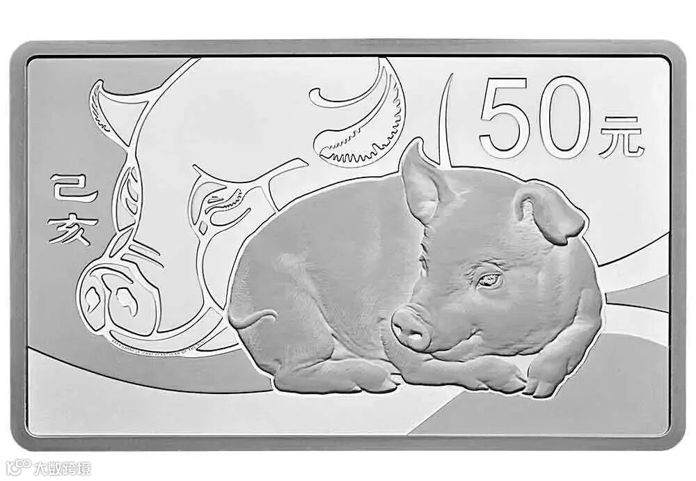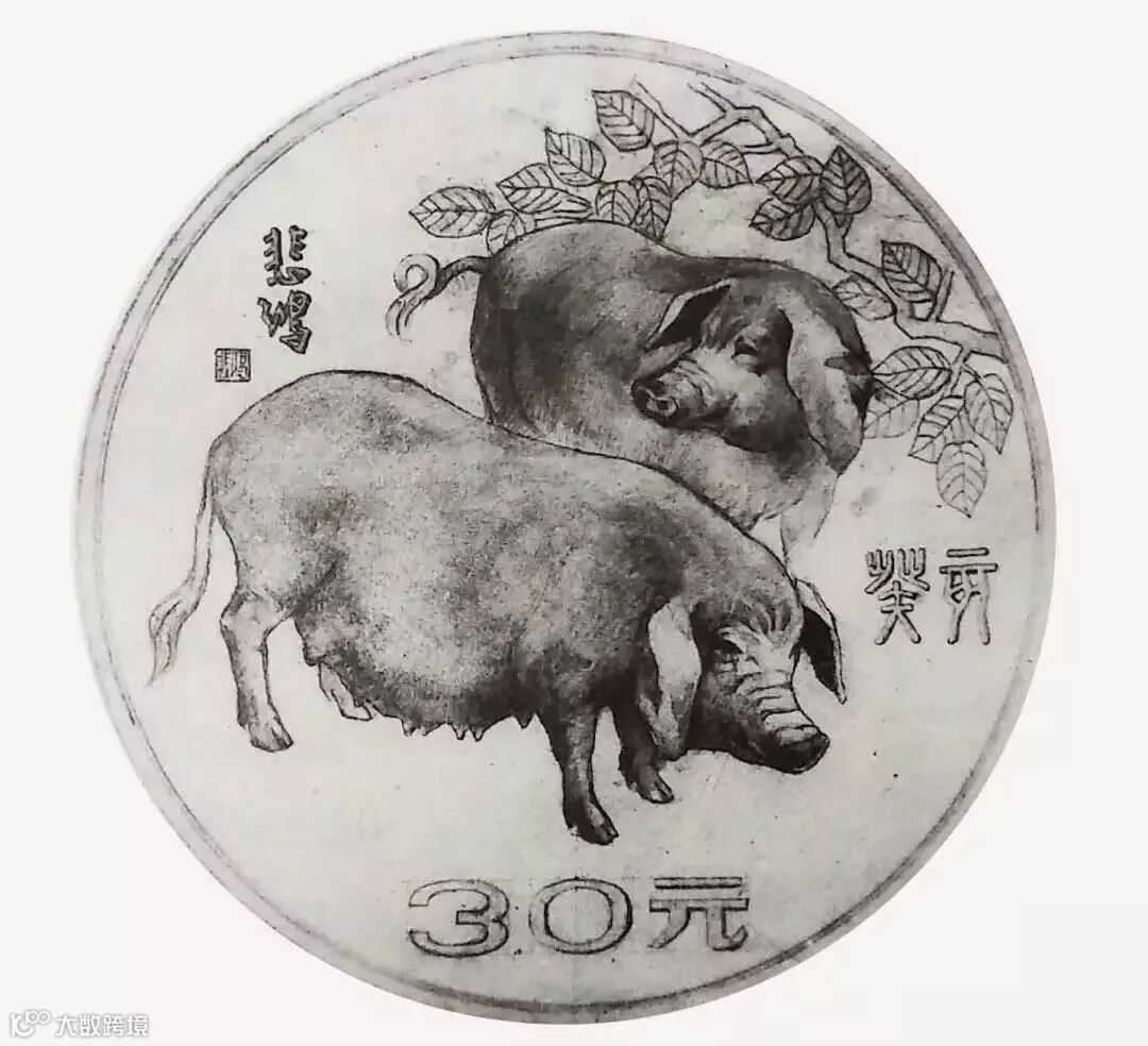 背面图案选用的是徐悲鸿的《双猪图》,这也是自《雄鸡图》之后,徐悲鸿的画作第二次入选生肖币图案。