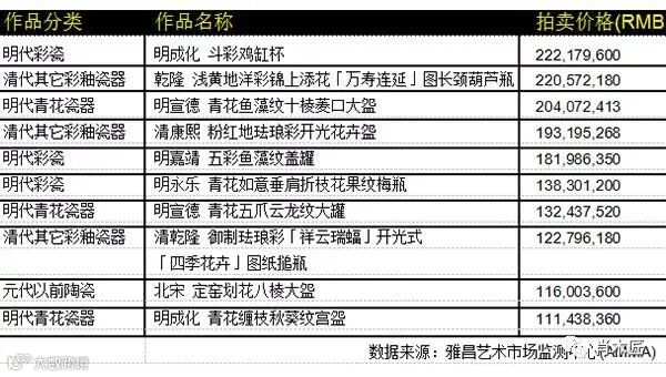 近十年,中国艺术品市场陶瓷拍卖按照拍卖价格由高到低排序: