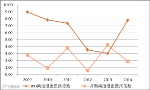 2009-2014年,IPO渠道退出平均回报倍数(6.43倍)显著高于并购渠道退出平均回报倍数(2.37 倍).
