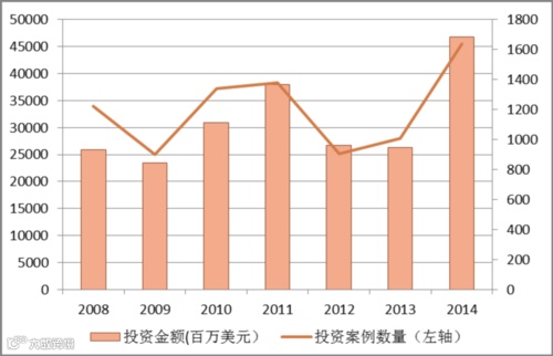 进2014年,过去两年偏审慎的资金也重现市场,投资案例数目与金额反弹均远超预期,增幅分别达到62.6% 和77.6%。