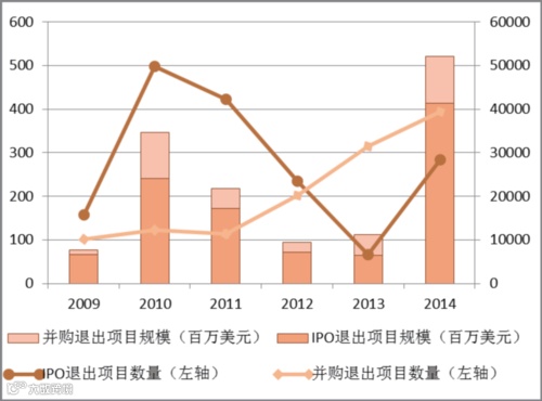 2014年全年,从PE项目最重要的IPO和并购两个渠道来看,退出数目与规模数据的同比增幅分别高达为78%和369%。