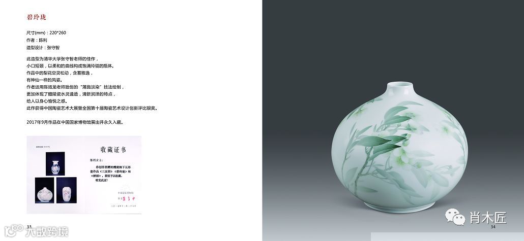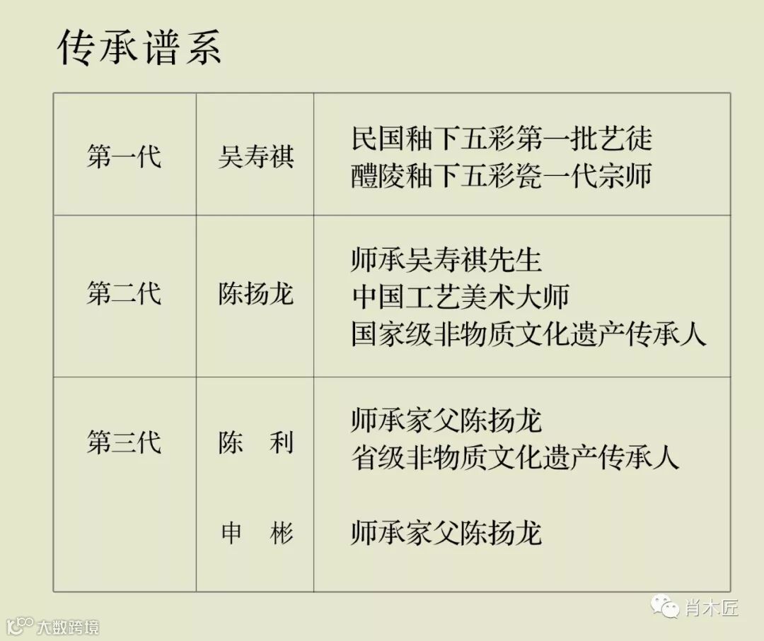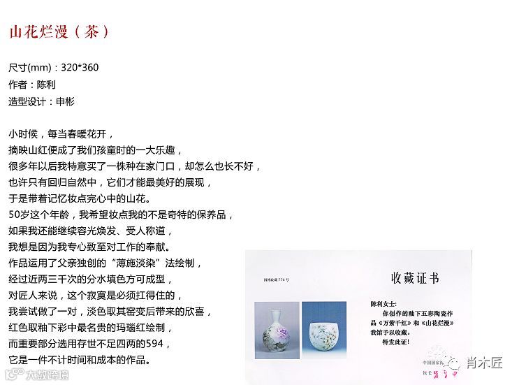 醴陵釉下五彩瓷烧制技艺”,这块沉甸甸的牌子就挂在他们工作室所在的这栋不显眼的小楼上。长女陈利是其得力助手,幼子陈志峰负责成型工艺,儿媳申彬传承其技艺。在他去世后,3个子女带领十几位徒弟,在困难的境况下仍然坚持传承陈扬龙技艺精神,坚守高品质艺术瓷的道路,以此来发展醴陵瓷窑口的艺术特色。目前,陈利已成为湖南省级非遗传承人,在色料、泥釉配制、绘制技法等多方面进行深入研究,使传承技法不断完善。由于“薄施淡染”技法制作的作品以素雅、清淡、渐染的风格自成一派,对色料要求甚高,要求色彩细腻、过渡缓和,因此,陈利与申彬不断进行适合该技法的复合色研发。▲