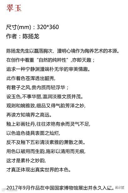 他认为,陶瓷是由胎釉、器形、工艺和装饰等构成的一门综合艺术,不能“以瓷当纸”,而忽略造型设计、制瓷工艺、装饰风格等陶瓷元素的有机结合,应该坚持陶瓷艺术的特性,用陶瓷的语言来表达陶瓷艺术,始终与中国画保持借鉴而不同化的距离。
