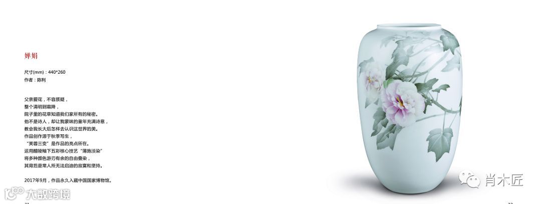 目前,陈利已成为湖南省级非遗传承人,在色料、泥釉配制、绘制技法等多方面进行深入研究,使传承技法不断完善。由于“薄施淡染”技法制作的作品以素雅、清淡、渐染的风格自成一派,对色料要求甚高,要求色彩细腻、过渡缓和,因此,陈利与申彬不断进行适合该技法的复合色研发,此次展览展出的作品《移富贵于平安》便是陈利与申彬在复合色研发上取得突破的例证,她们将新调配的多种复色在该作品上进行大面积叠加,使色料在原有的基础上更加丰富多变,又不失清澈润泽。