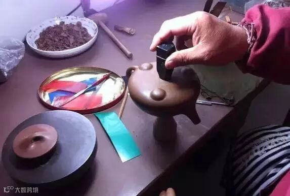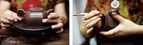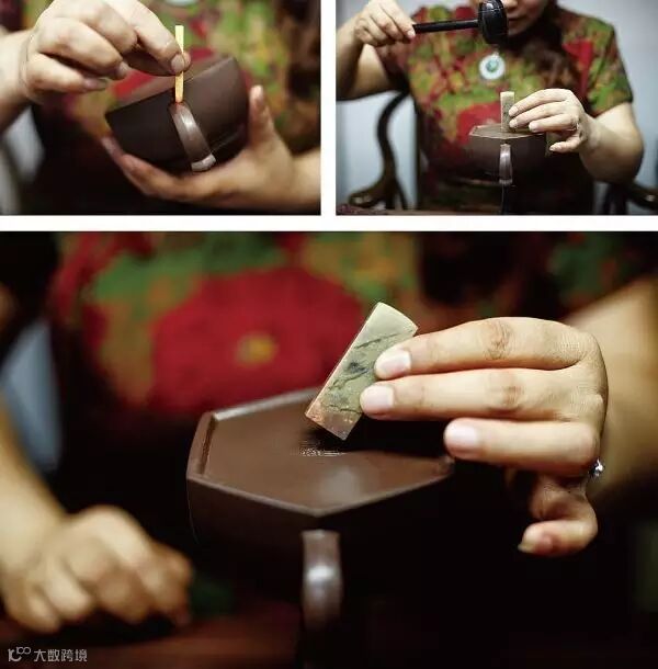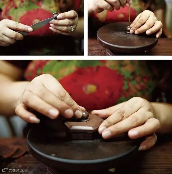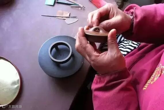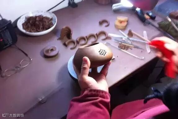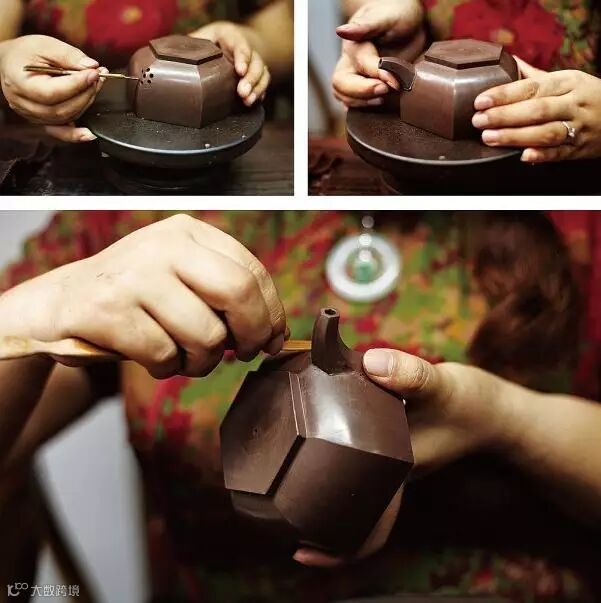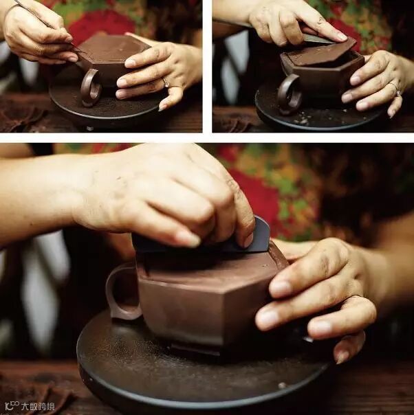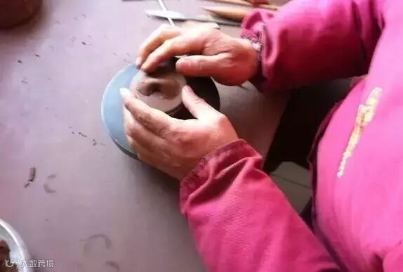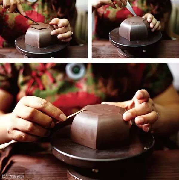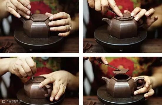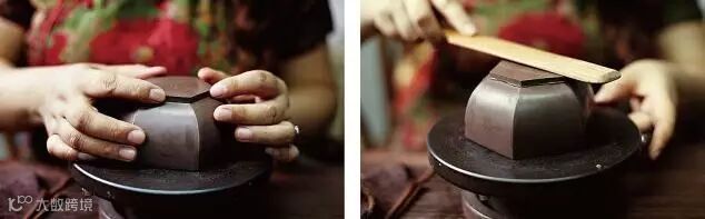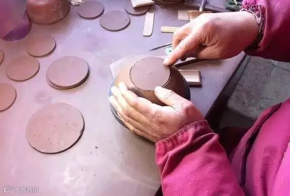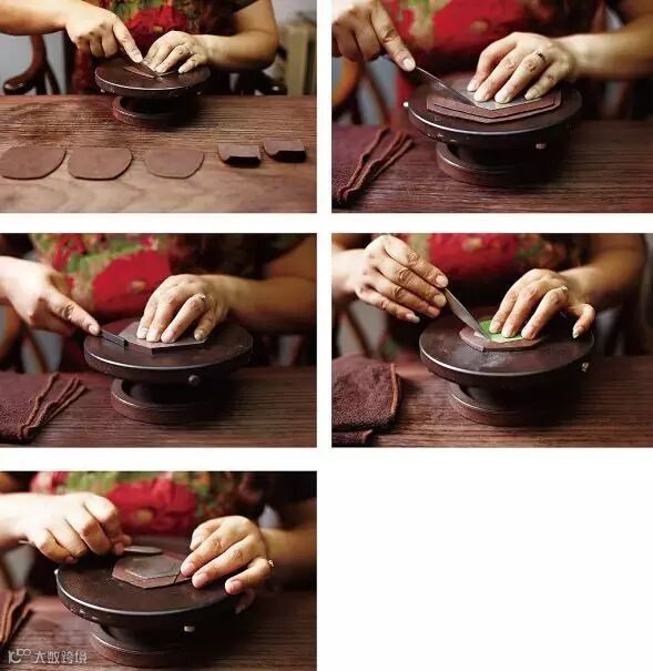 适用于上下两等、大小相同的器型,如“合欢”壶、“合盘”壶等,操作程序是把划好的泥片,先用虚坨等工具分别拍成上下需合围的深浅半球形,然后将上下两半部分用脂泥粘合。