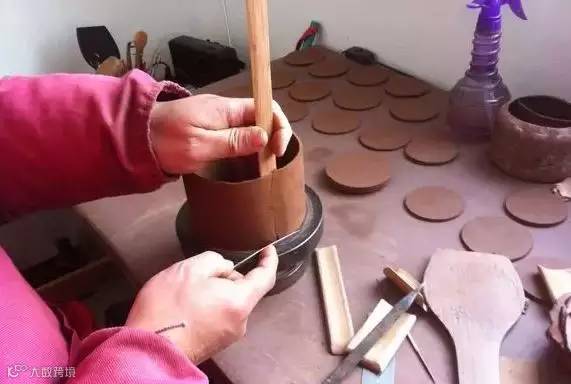 适用于圆器。根据设计的茶壶直径,加上烧成时的收缩系数,乘以圆周率,并加上两端接头的富余量以及身筒的高度,把泥片打制成长方形的泥条。将泥条在转盘上围成圆筒或锥形筒,把两端叠合,用鳑鲏刀斜向一次切开叠合处,用脂泥将对接的切口粘连好,身筒就围好了。