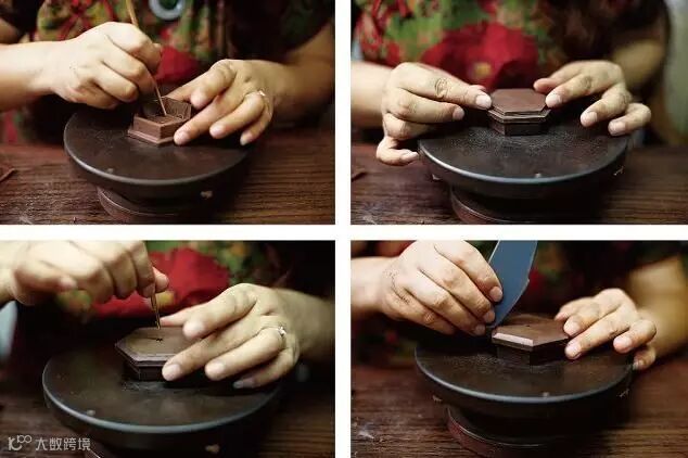 适用于方器。操作程序是先按产品设计要求的尺寸配制样板,依样板在泥片上裁切,把裁切好的泥片,按器形规格要求用脂泥粘贴镶接,直至完整地拼镶好一件方形或多边的小泥盒子,然后一如打身筒的办法配制和连接其他附件。