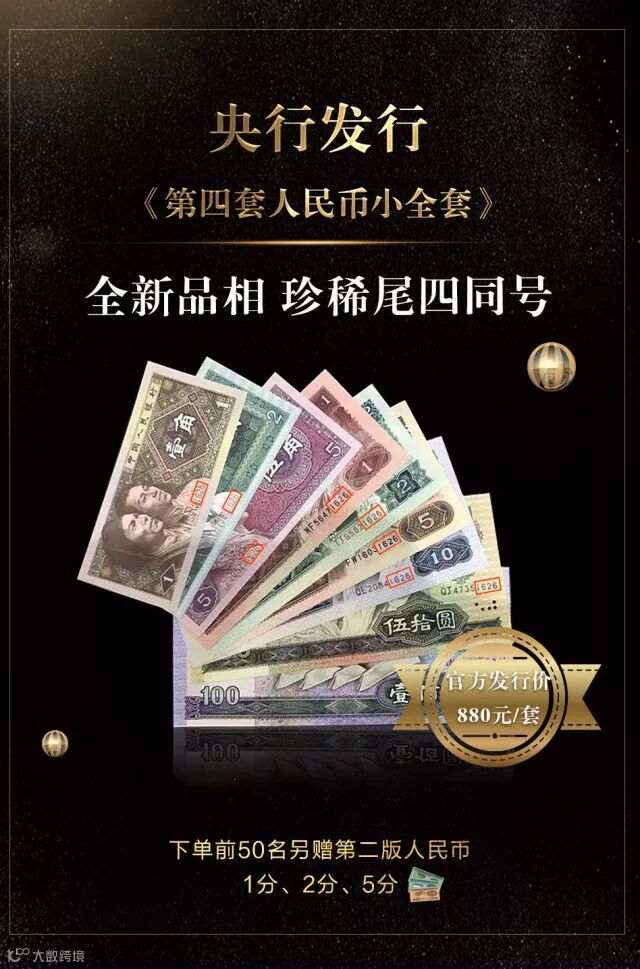《第四套人民币小全套尾四同号》由中国人民银行发行的原版纸币真钞拆分装帧而成,含1角、2角、5角、1元、2元、5元、10元、50元、100元共9种面额,所有纸钞末四位号码全部相同,万里挑一,每套精装册均附赠珍稀粮票,再赠第二版人民币1分、2分、5分!