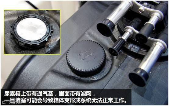 一般情况下,在尿素箱上均设有通气阀,其作用是保证尿素箱内的压力处于正常水平。随着尿素溶液的不断的消耗,如果通气阀损坏或者堵塞的话,箱体内会出现真空,这样一方面可能会损坏箱体,同时尿素泵的工作也会受到影响。所以在车辆使用的过程中要注意检查通气阀。