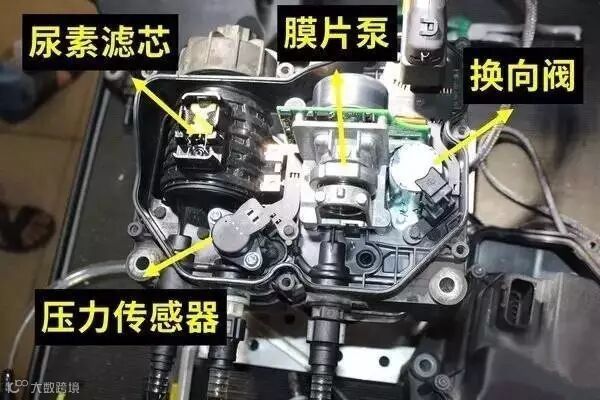 尿素泵的内部其实并不复杂,主要由膜片泵、电磁换向阀、压力传感器、尿素滤芯、电加热系统、引线框等部件组成。