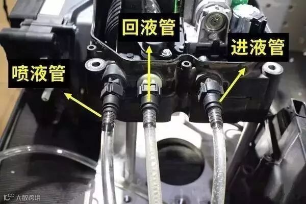 尿素泵外侧有三个尿素溶液管路,左边的是喷液管,中间的是回液管,右边的为进液管。