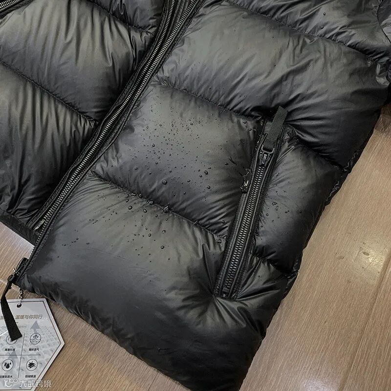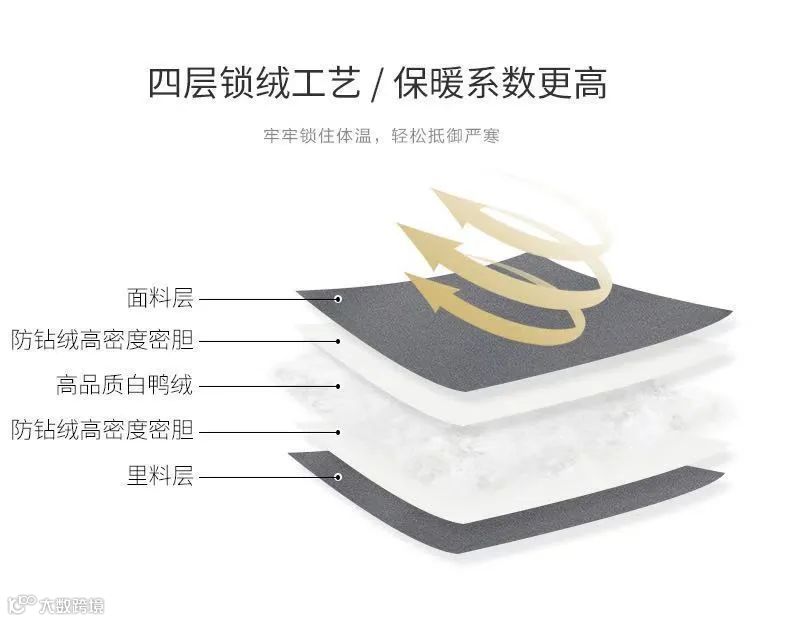 外层高密度防水面料(需确认)、内层增加防绒胆布固定住白鸭绒、里层采用亲肤里布,一共 4 层各层阻挡,针脚细密。