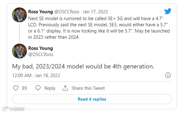 最近苹果显示屏供应链的 Ross Young也引用泄漏消息源声称,下一代iPhone SE的生产将在1月下旬开始,最有可能在5月底或4月初推出。