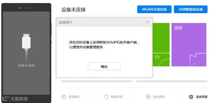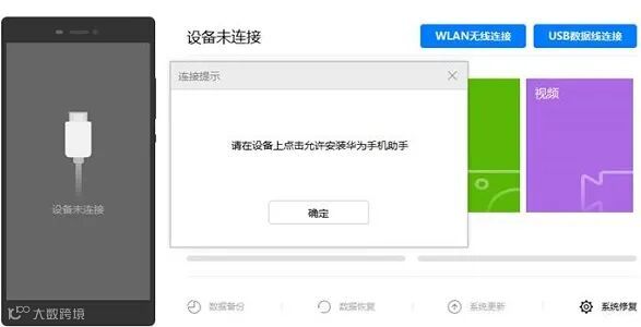 3、接着在手机上会自动安装华为手机助手,点击“确定”,如果之前安装过了这一步就可以跳过了。