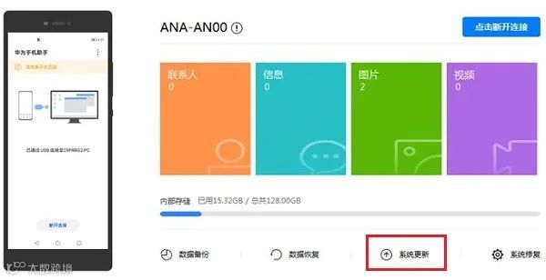 5、连接完成后,在电脑端点击“系统更新”,如图所示。在手机上点击是没有用的。