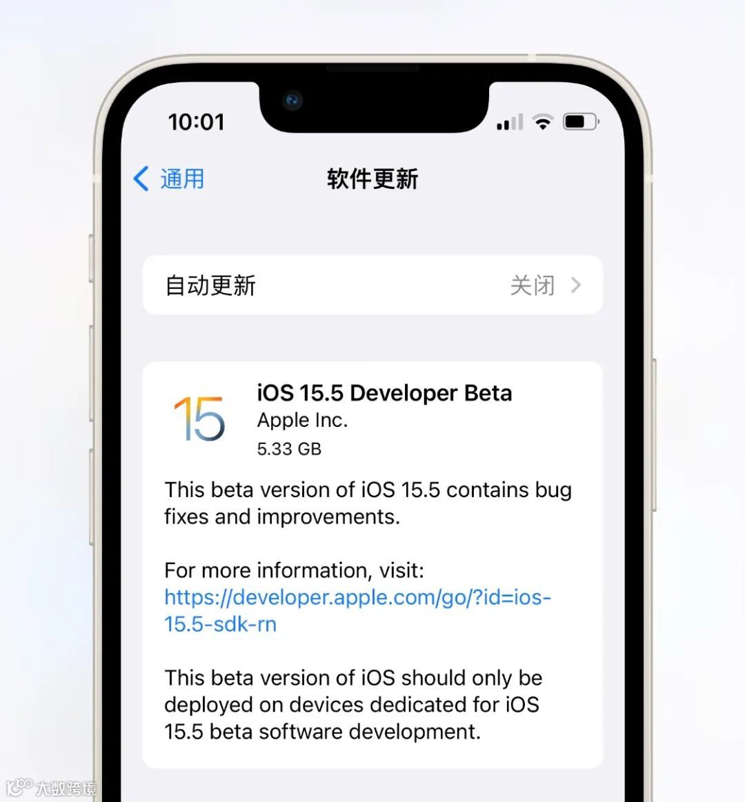 此次iOS15.5的测试版本号是(19F5047e)由于此次更新版本较大,所有更新包也会占比较大的容量,更新包高达5.4G左右。