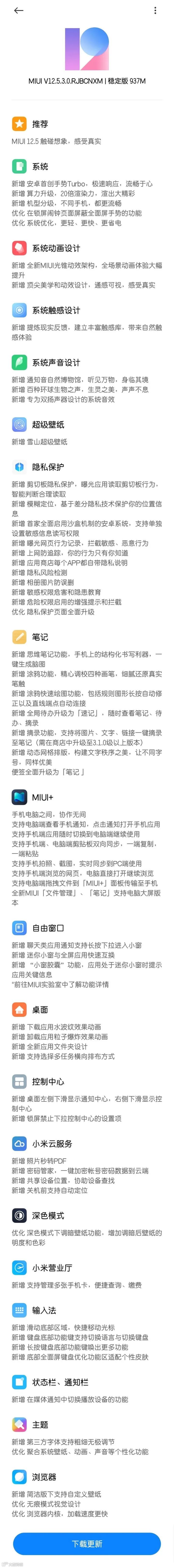 以上是小编此次MIUI 12.5稳定版可值得关注的部分亮点,当然还有其他的一些功能的更新与优化,具体的更新目录可以查看以下这张图: