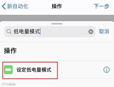 第三步:点击“添加操作”,搜索“低电量模式”,选择“设定低电量模式”: