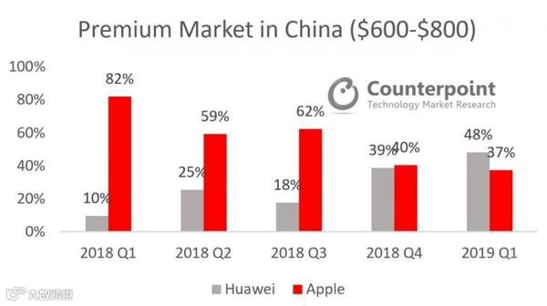 6月23日,Counterpoint Research发布2019年第一季度中国智能手机市场,华为以48%市场份额成功超越苹果。