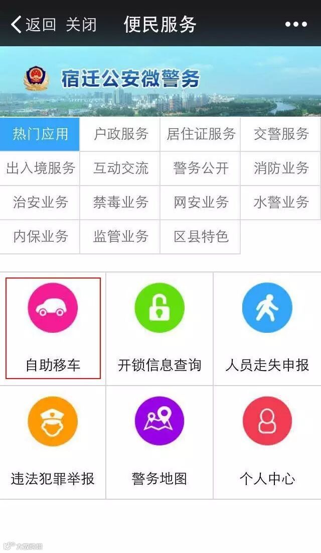 宿迁市公安局依托微信公众号,开发了自助移车提醒系统,提供便民服务。市民在车辆被其他车辆挡住后,除了拨打110求助外,增加了微信公众号报警渠道。