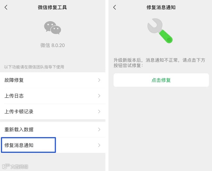 根据页面提示来看,该功能是在升级新版本后,消息通知不正常的话,可以通过「点击修复」来进行修复。