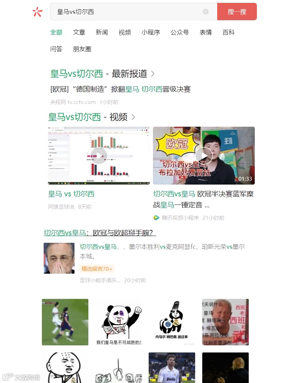 在升级后,PC端“搜一搜”的搜索结果也变得更加全面。举个例子,小雷键入“皇马vs切尔西”作为搜索关键词,除了常规网页搜索能够看到的最新报道、最新视频、百科资料以外,和微信紧密相关的公众号文章、表情包以及小程序也是一应俱全,至于外部网页和淘宝购物等基本搜不出来,需要通过外链网页搜索方可实现。