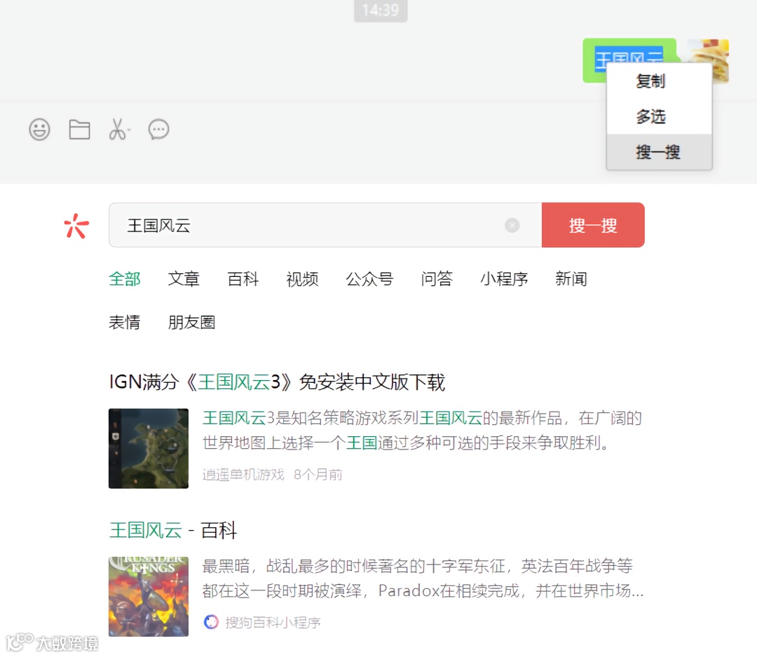不仅如此,手机端微信在去年九月实装的简易搜索功能,也出现在PC端微信3.3.0内测版中。如图所示,用户可以通过鼠标右键框选聊天窗口当中任一消息触发二级菜单,二次菜单最后一个功能就是新增的搜一搜功能,用户只要点击这个窗口就可以自动触发搜索界面,可以随意打开搜索结果。