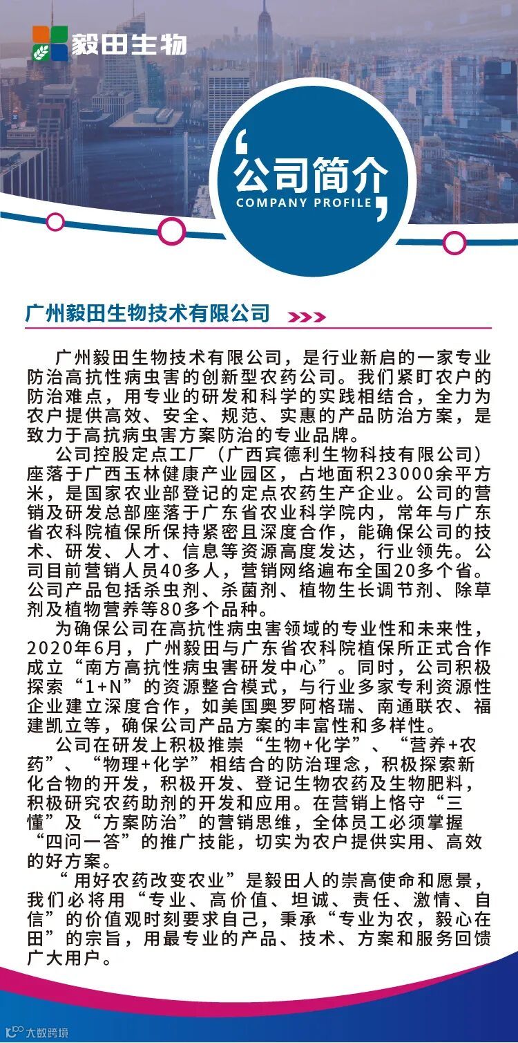 公司致力于农药的研究开发和推广应用,集技术、研发、生产、销售、服务为一体。定位为作物专业化的科技型公司,围绕作物核心病、虫、草害及营养需求,提供专业的解决方案。公司通过技术研发以及品牌营销相结合,科学、专业的为农户提供技术服务及方案需求。