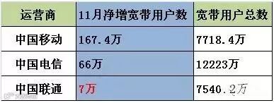 中国联通11月宽带用户数净减7万户,今年累计净增宽带用户数307.2万户,宽带用户总数7540.2万户。